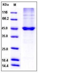 The recombinant human PON3 consists of 373 amino acids and predicts a molecular mass of 42 kDa. It migrates as an approximately 45 KDa band in SDS-PAGE under reducing conditions.