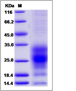 The recombinant human TSPAN1 comprises 122 amino acids and has a predicted molecular mass of 14.1 kDa. The apparent molecular mass of the protein is approximately 32, 27, 18 and 14 kDa in SDS-PAGE under reducing conditions due to glycosylation.