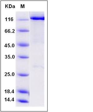 The recombinant human WWP2 /GST chimera consists of 1107 amino acids and has a calculated molecular mass of 126.7 kDa. The recombinant protein migrates as an approximately 120 kDa band in SDS-PAGE under reducing conditions.