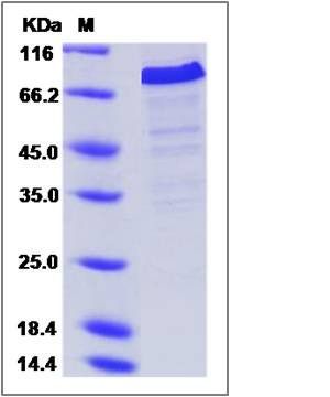 The secreted recombinant human TRIP10 consists of 556 amino acids and predicts a molecular mass of 64 KDa. The apparent molecular mass of the protein is approximately 84.2 KDa in SDS-PAGE under reducing conditions.