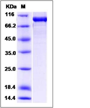 The recombinant human OPTN chimera consists of 814 amino acids and has a calculated molecular mass of 93.7 kDa. The recombinant protein migrates approximately 94 kDa band in SDS-PAGE under reducing conditions.