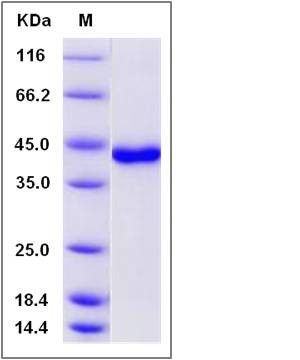 The secreted recombinant human USP46 consists of 366 amino acids and predicts a molecular mass of 42.4 KDa. The apparent molecular mass of the protein is approximately 43 Kda in SDS-PAGE under reducing conditions due to glycosylation.