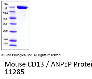 The recombinant mouse ANPEP consists of 909 amino acids and has a calculated molecular mass of 104 kDa. As a result of glycosylation, the recombinant protein migrates as an approximately 120-130 kDa protein in SDS-PAGE under reducing conditions.