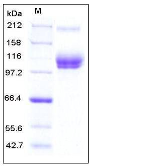 The recombinant mouse ALCAM/Fc is a disulfide-linked homodimer after removal of the signal peptide. The reduced monomer consists of 748 amino acids and has a predicted molecular mass of 84.2 kDa. Due to glycosylation, in SDS-PAGE under reducing conditions, rmALCAM/Fc migrates with approximately molecular mass of 105-110 kDa & 210 kDa corresponding to the monomer and homodimer.