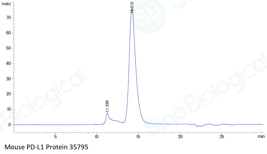 The secreted recombinant mouse CD274 comprises 231 amino acids and has a predicted molecular mass of 26.3 kDa. As a result of glycosylation, it migrates as an approximately 40-45 kDa band in SDS-PAGE under reducing conditions.