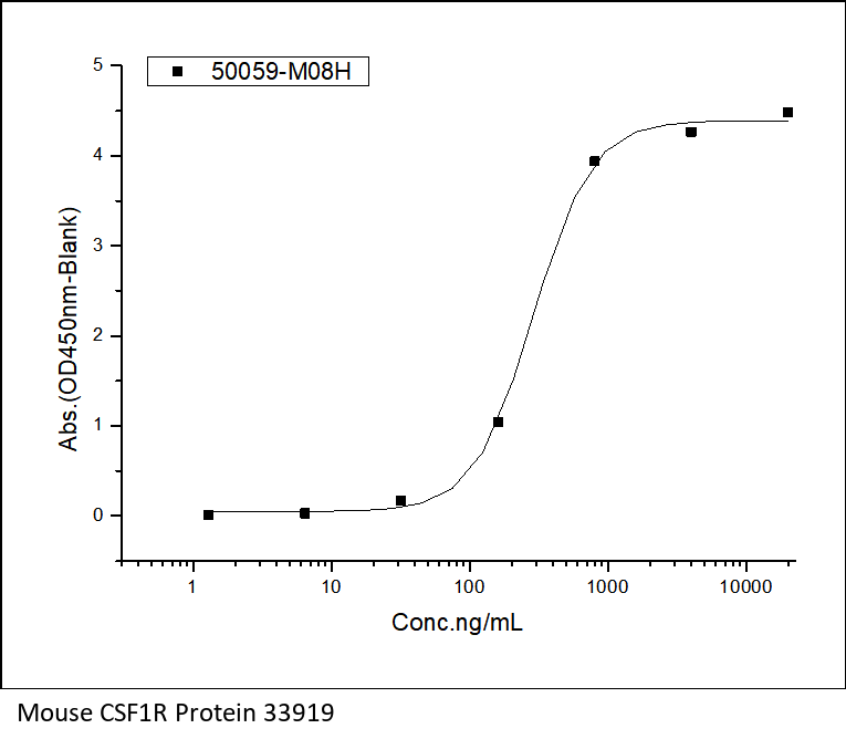 3. Immobilized mouse CSF1R-His (Cat:50059-M08H) at 10 ug/mL (100 ul/well) can bind biotinylated human CSF1-his, The EC50 of biotinylated human CSF1-his is 0.50 ug/mL.