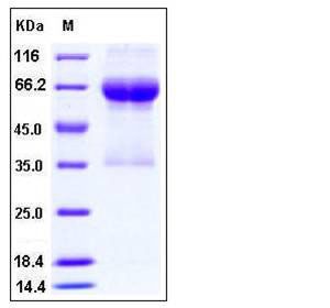 The recombinant mouse PDCD1/Fc chimera is a disulfide-linked homodimeric protein. The reduced monomer consists of 391 amino acids and has a predicted molecular mass of 44.2 kDa. In SDS-PAGE under reducing conditions, the apparent molecular mass of rm PDCD1/Fc monomer is approximately 60-65 kDa due to glycosylation.