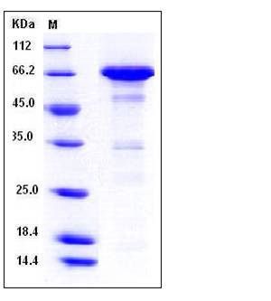 The recombinant mouse CCL8/NusA chimera consisting of 587 amino acids and has a calculated molecular mass of 66 kDa as estimated in SDS-PAGE under reducing conditions.