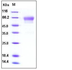 The recombinant mouse PDPN/Fc is a disulfide-linked homodimer after removal of the signal peptide. The reduced monomer consists of 367 amino acids and has a predicted molecular mass of 40.6 kDa. In SDS-PAGE under reducing conditions, the apparent molecular mass of rmPDPN/Fc monomer is approximately 60-65 kDa due to glycosylation.