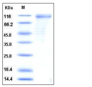 The recombinant mouse CD36/Fc chimera is a disulfide-linked homodimer. The reduced monomer consists of 658 amino acids and has a calculated molecular mass of 74.5 kDa. As a result of glycosylation, the apparent molecular mass of rmCD36/Fc monomer is approximately 110-120 kDa in SDS-PAGE under reducing conditions.