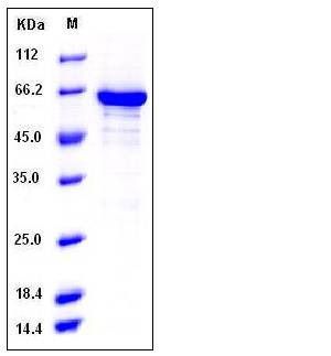 The secreted recombinant mouse EPHB1/GST chimera consists of 631 amino acids and has a calculated molecular mass of 72.4 kDa. The recombinant protein migrates as an approximately 60 kDa band in SDS-PAGE under reducing conditions.
