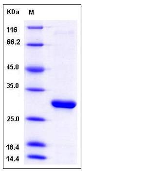 The recombinant mouse HPGD consisting of 279 amino acids and has a calculated molecular mass of 30.6 kDa. rmHPGD migrates as an approximately 30 kDa band in SDS-PAGE under reducing conditions as predicted.