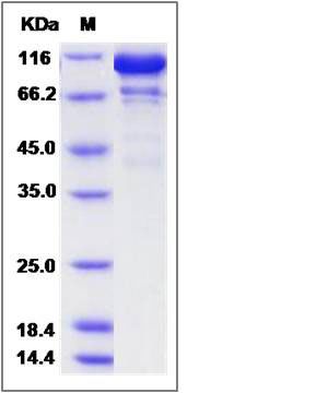The recombinant mouse PTPRC/GST chimera consists of 937 amino acids and has a calculated molecular mass of 108.2 kDa. The recombinant protein migrates as an approximately 110 kDa band in SDS-PAGE under reducing conditions.