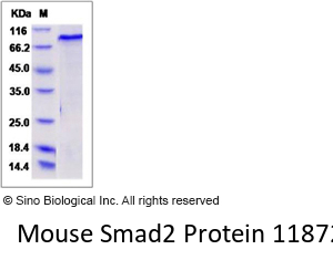 The recombinant mouse SMAD2/GST chimera consists of 703 amino acids and has a calculated molecular mass of 80 kDa. The recombinant protein migrates as an approximately 90 kDa band in SDS-PAGE under reducing conditions.
