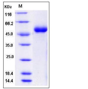 The secreted recombinant mouse DDR1 comprises 406 amino acids and has a calculated molecular mass of 45.4 kDa. As a result of glycosylation, the apparent molecular mass of rm DDR1 is approximately 50 kDa in SDS-PAGE under reducing conditions.