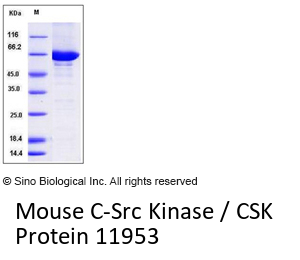 The secreted recombinant mouse CSK/GST chimera consists of 687 amino acids and has a calculated molecular mass of 78.5 kDa. The recombinant protein migrates as an approximately 65 kDa band in SDS-PAGE under reducing conditions.