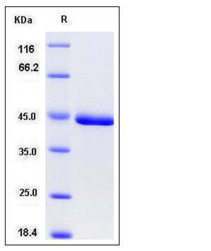 The secreted recombinant mouse CHI3L1 comprises 371 amino acids and has a calculated molecular mass of 42.3 kDa. As a result of glycosylation, the apparent molecular mass of rmCHI3L1 is approximately 50 kDa in SDS-PAGE under reducing conditions.