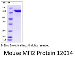 The secreted recombinant mouse MFI2 comprises 700 amino acids and has a calculated molecular mass of 77.5 kDa. The apparent molecular mass of rmMFI2 is approximately 80 kDa in SDS-PAGE under reducing conditions.