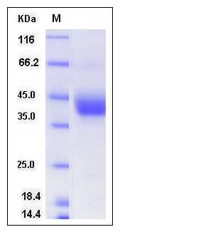 The recombinant mouse ART4 consists of 251 amino acids and predicts a molecular mass of 28.2 KDa. In SDS-PAGE under reducing conditions, the apparent molecular mass of rmART4 is approximately 40-45 KDa as a result of glycosylation.