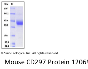 The recombinant mouse ART4 consists of 251 amino acids and predicts a molecular mass of 28.2 KDa. In SDS-PAGE under reducing conditions, the apparent molecular mass of rmART4 is approximately 40-45 KDa as a result of glycosylation.