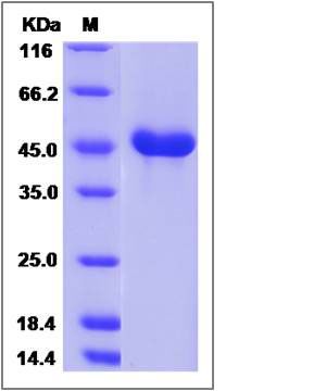 The recombinant mouse REG2 comprises 389 amino acids and has a predicted molecular mass of 43.6 kDa. The apparent molecular mass of the protein is approximately 45.4 kDa in SDS-PAGE under reducing conditions.
