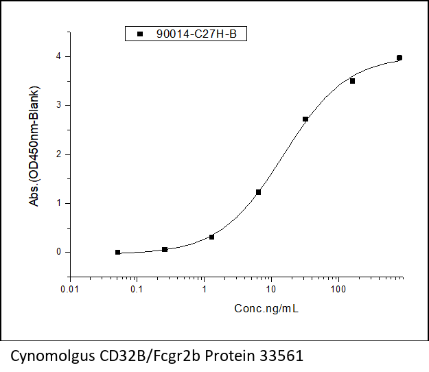 The recombinant cynomolgus CD32b consists of 211 amino acids and has a calculated molecular mass of 23.5 kDa. The apparent molecular mass of the recombinant protein is approximately 34 kDa in SDS-PAGE under reducing conditions due to glycosylation.