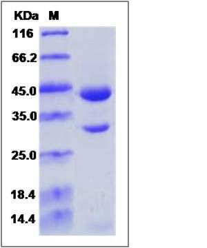 The recombinant cynomolgus PDGFB is a disulfide-linked homodimer. The reduced monomer comprises 345 amino acids and has a calculated molecular mass of 38.9 KDa. The apparent molecular mass of it is approximately 43 and 32 KDa in SDS-PAGE.