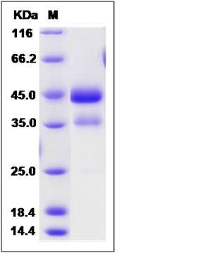The recombinant cynomolgus ACVR1 is a disulfide-linked homodimer. The reduced monomer comprises 342 amino acids and has a calculated molecular mass of 38.2 KDa.The apparent molecular mass of the protein is approximately 44 and 37 KDa respectively in SDS-PAGE.