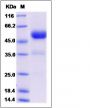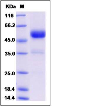 The recombinant cynomolgus ACVRL1 is a disulfide-linked homodimer. The reduced monomer comprises 338 amino acids and has a calculated molecular mass of 37.8 KDa.The apparent molecular mass of the protein is approximately 53 KDa respectively in SDS-PAGE.