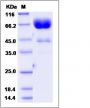The recombinant cynomolgus CD80 is a disulfide-linked homodimer. The reduced monomer comprises 449 amino acids and has a calculated molecular mass of 50.9 KDa.The apparent molecular mass of the protein is approximately 65 and 44 KDa respectively in SDS-PAGE.