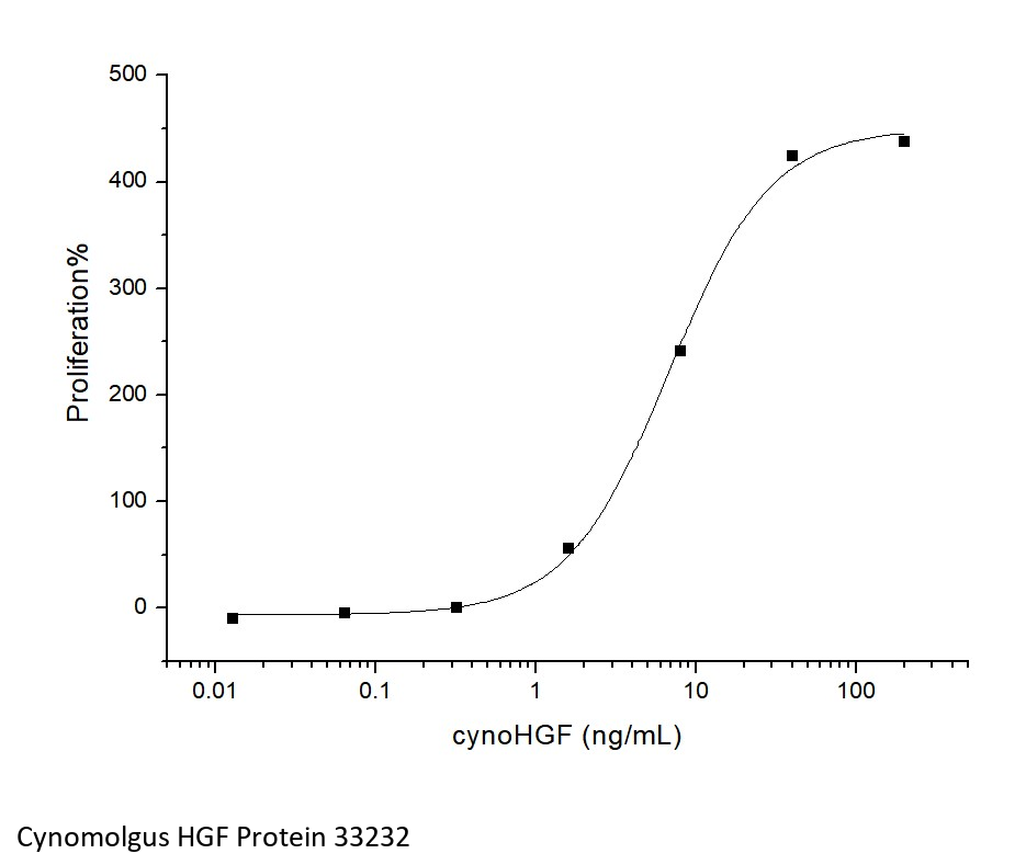 The recombinant cyno HGF consists of 697 amino acids and has a calculated molecular mass of 79.6 KDa. It migrates as 89, 58, 34 and 32 KDa band in SDS-PAGE under reducing conditions.