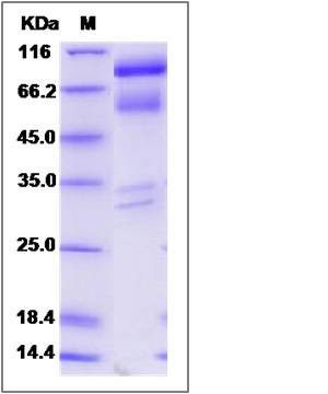 The recombinant cyno HGF consists of 697 amino acids and has a calculated molecular mass of 79.6 KDa. It migrates as 89, 58, 34 and 32 KDa band in SDS-PAGE under reducing conditions.