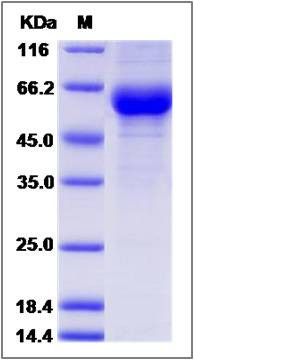 The recombinant cynomolgus TEK is a disulfide-linked homodimer. The reduced monomer comprises 964 amino acids and has a calculated molecular mass of 107.6 KDa.The apparent molecular mass of the protein is approximately 63 KDa respectively in SDS-PAGE.