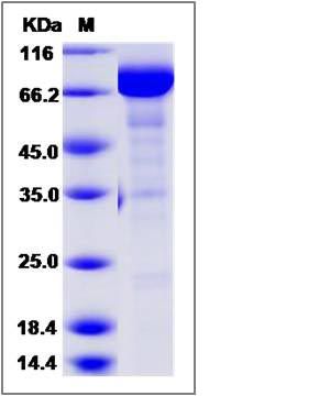 The recombinant cynomolgus NRP1 is a disulfide-linked homodimer. The reduced monomer comprises 599 amino acids and has a calculated molecular mass of 67.5 KDa.The apparent molecular mass of the protein is approximately 67-77 KDa in SDS-PAGE.