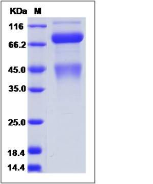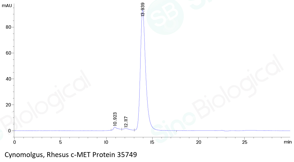 The recombinant cynomolgus/rhesus MET comprises 919 amino acids and has a calculated molecular mass of 103.1 KDa. The apparent molecular mass of it is approximately 128.2, 77.6 and 45.7 KDa in SDS-PAGE under reducing conditions.