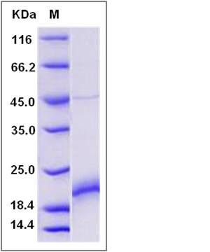The recombinant rat GDNF consists of 150 amino acids and predicts a molecular mass of 17.1 KDa. It migrates as an approximately 20 KDa band in SDS-PAGE under reducing conditions.
