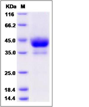 The recombinant rat ACVR1B/Fc is a disulfide-linked homodimer. The reduced monomer comprises 344 amino acids and has a predicted molecular mass of 38.4 kDa. The apparent molecular mass of the protein is approximately 42 and 34 kDa in SDS-PAGE under reducing conditions.