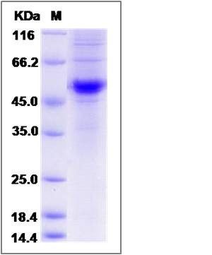 The recombinant rat CD40LG comprises 406 amino acids and predicts a molecular mass of 44.4 kDa. The apparent molecular mass of the recombinant protein is approximately 53 kDa in SDS-PAGE under reducing conditions due to glycosylation.