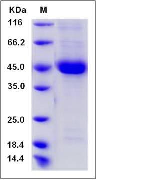 The recombinant rat PVRL2 comprises 331 amino acids and predicts a molecular mass of 36 kDa. The apparent molecular mass of the recombinant protein is approximately 46 kDa in SDS-PAGE under reducing conditions due to glycosylation.