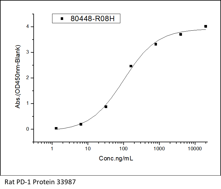 Immobilized rat PDCD1-His at 10 ug/ml (100 ul/well) can bind rat CD274-Fc(Cat?80450-R02H), The EC50 of rat CD274-Fc(Cat?80450-R02H) is 40-80ng/ml.