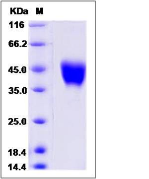 The recombinant rabbit CD38 consists of 267 amino acids and predicts a molecular mass of 30.5 KDa. It migrates as an approximately 37-46 KDa band in SDS-PAGE under reducing conditions.