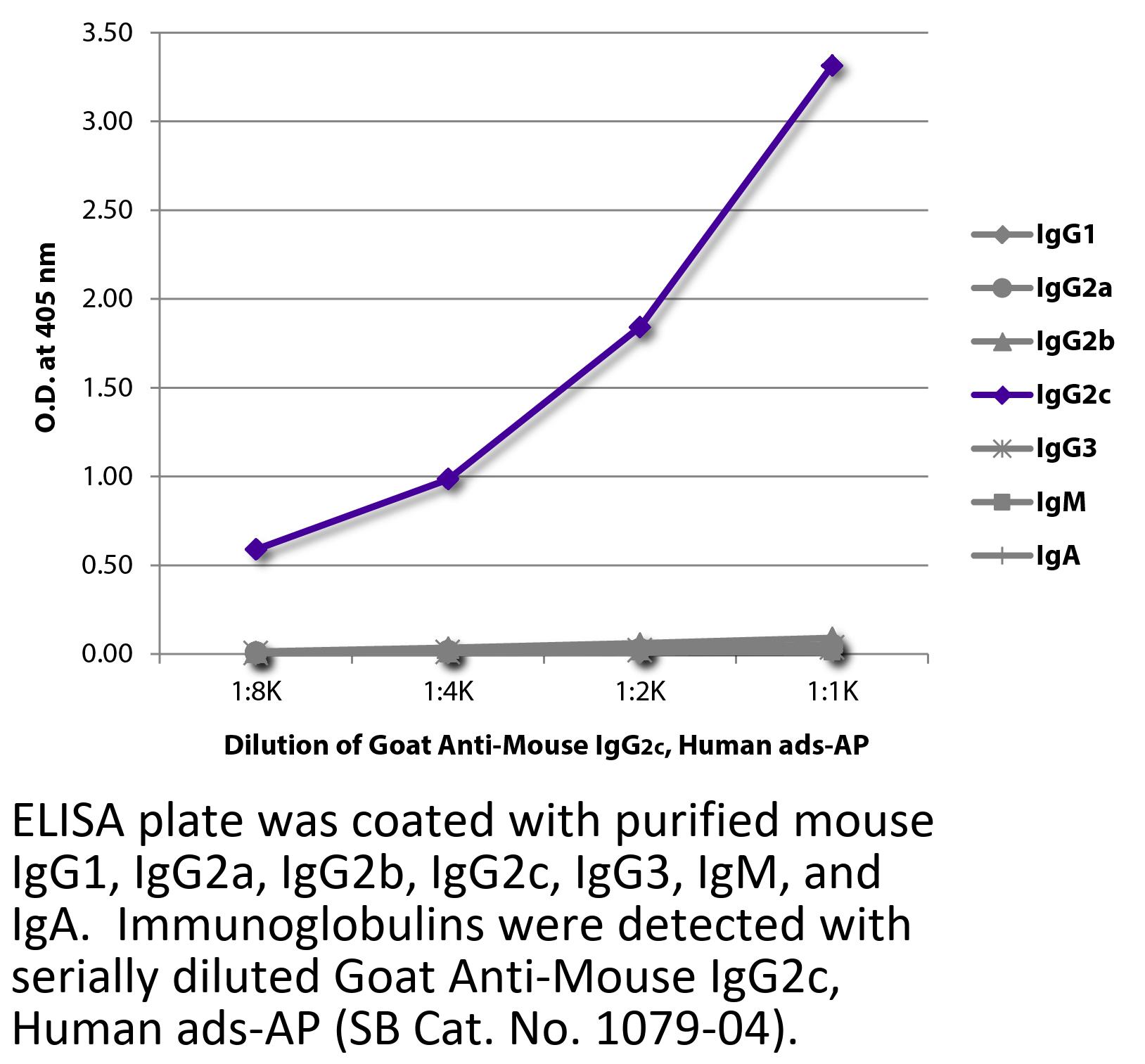 Goat Anti-Mouse IgG2c-AP antibody with minimal reactivity to human proteins for use in ELISA, immunohistochemistry, and western blot assays.