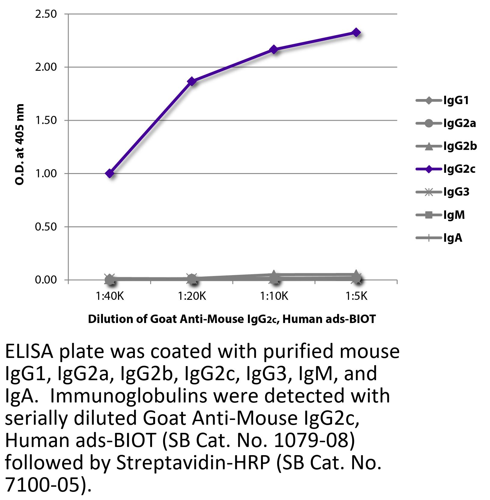 Goat Anti-Mouse IgG2c-Biotin antibody with minimal reactivity to human proteins for use in ELISA, flow cytometry, immunohistochemistry, and western blot assays.