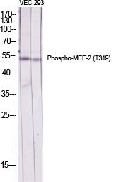 Phospho-MEF-2 (T319) Polyclonal Antibody detects endogenous levels of MEF-2 protein only when phosphorylated at T319.