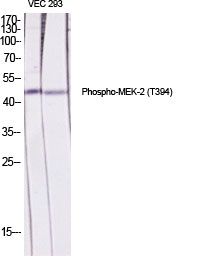 Phospho-MEK-2 (T394) Polyclonal Antibody detects endogenous levels of MEK-2 protein only when phosphorylated at T394.