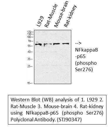 Phospho-NF Kappa B-p65 (S276) Polyclonal Antibody detects endogenous levels of NF Kappa B-p65 protein only when phosphorylated at S276.
