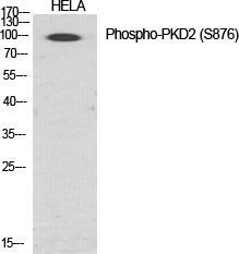 Phospho-PKD2 (S876) Polyclonal Antibody detects endogenous levels of PKD2 protein only when phosphorylated at S876.